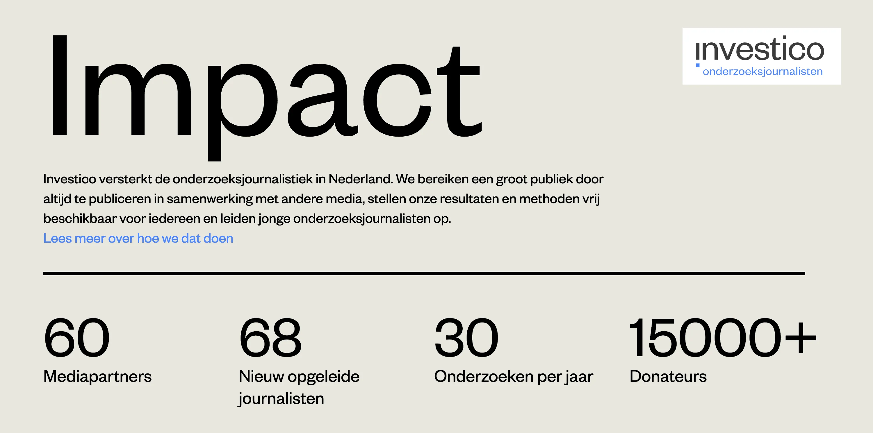 Het platform publiceert zelf niet. In plaats daarvan verschijnen onderzoeken via samenwerkende media. Inmiddels werkt Investico samen met een breed netwerk van landelijke en regionale titels. Daardoor bereiken onderzoeksverhalen een groter en diverser publiek. Dat vergroot niet alleen het bereik, maar ook de maatschappelijke betekenis van de publicaties.